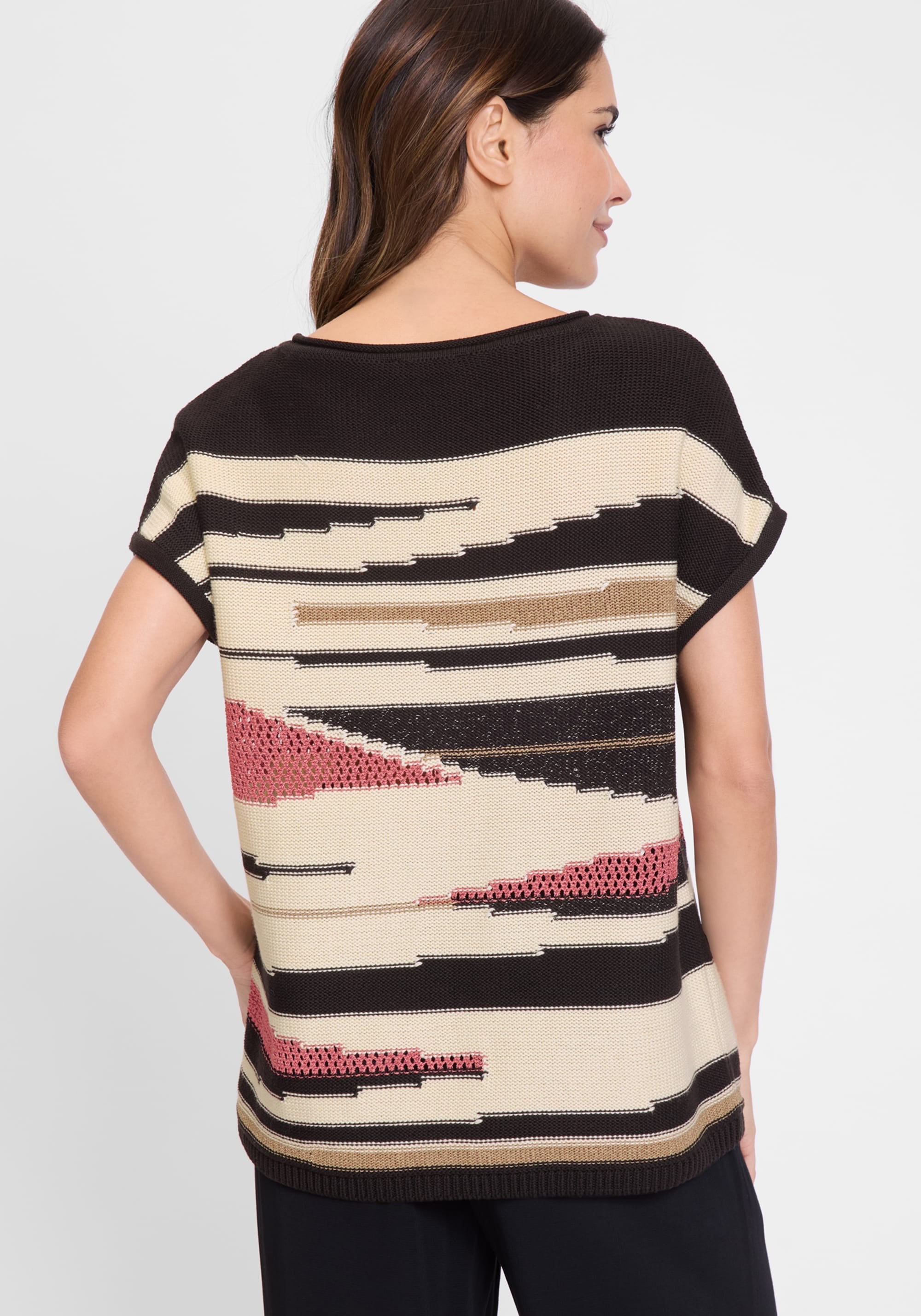 This cap sleeve sweater makes a bold statement with its dynamic, Aztec-inspired design.