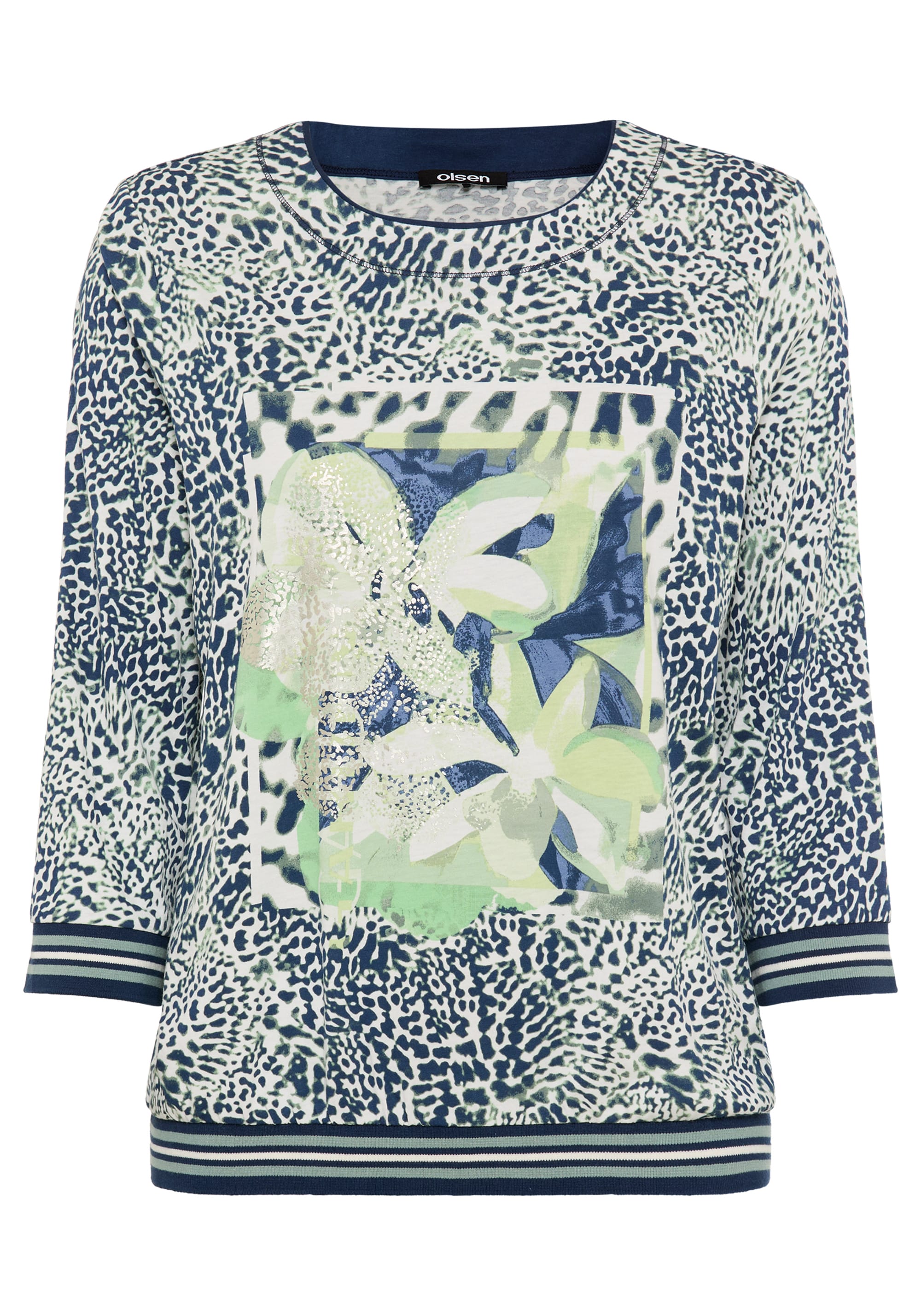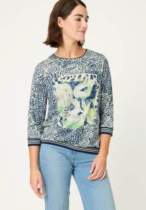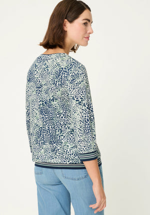 A statement T-shirt with refined sophistication, this eye-catching style blends bold motifs – featuring an allover animal print, abstract floral placement, and striped knit trims – finished with subtle silver foil accents for a touch of glamour.