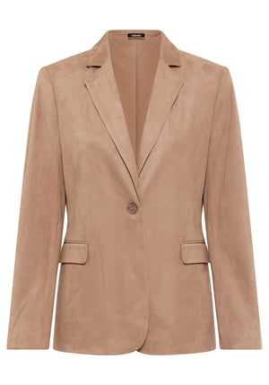 A beautifully refined staple, this faux suede blazer blends timeless elegance with modern comfort, crafted from a buttery-soft fabric that feels luxurious to wear.