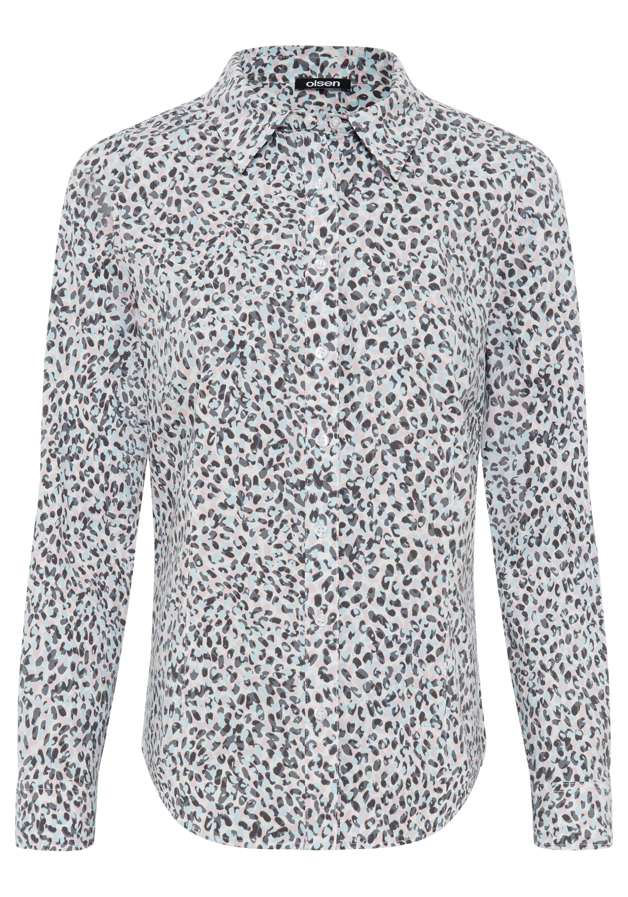 Classic shirt styling meets a funky leopard print in an unexpected color combination of pink and blue.