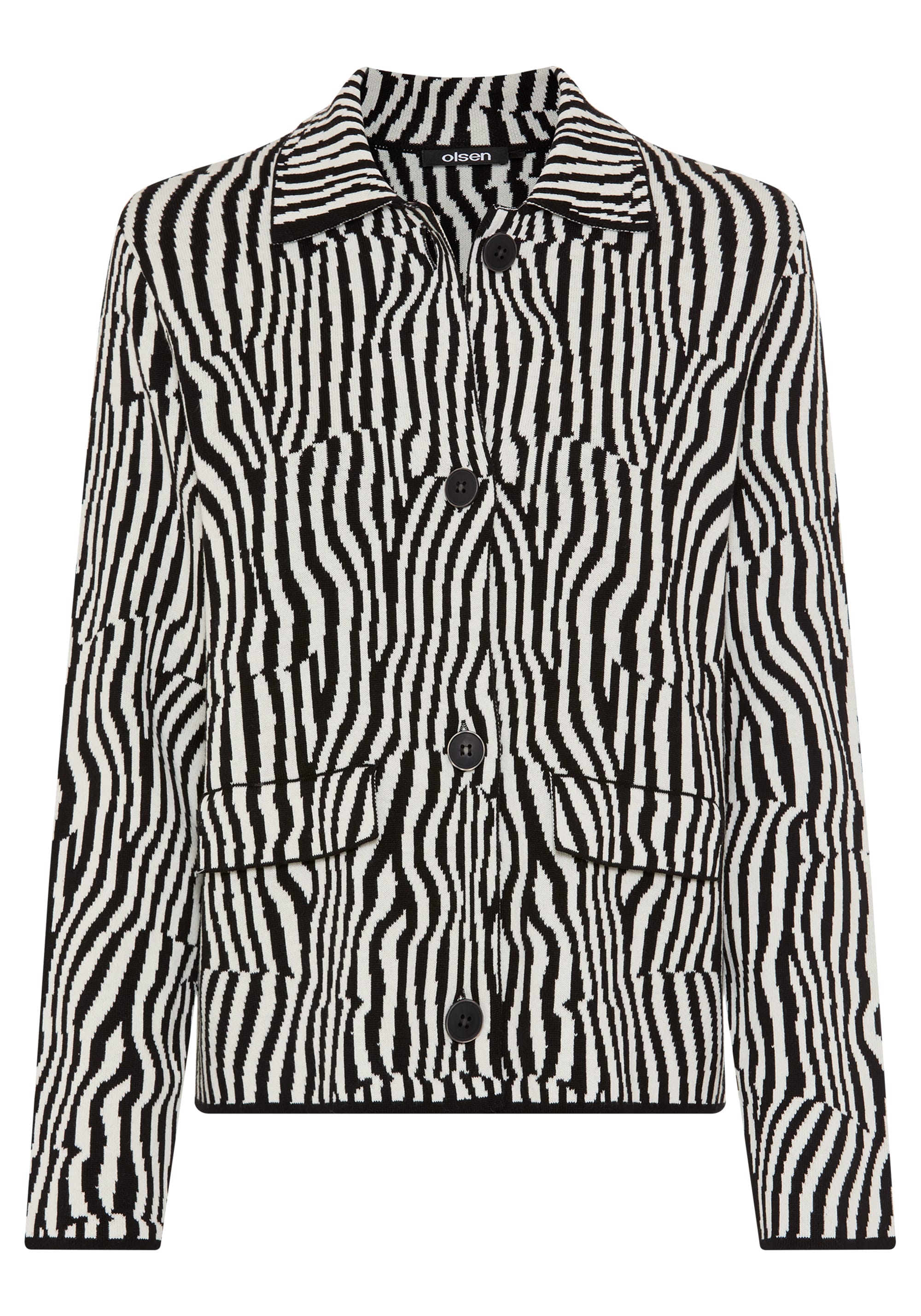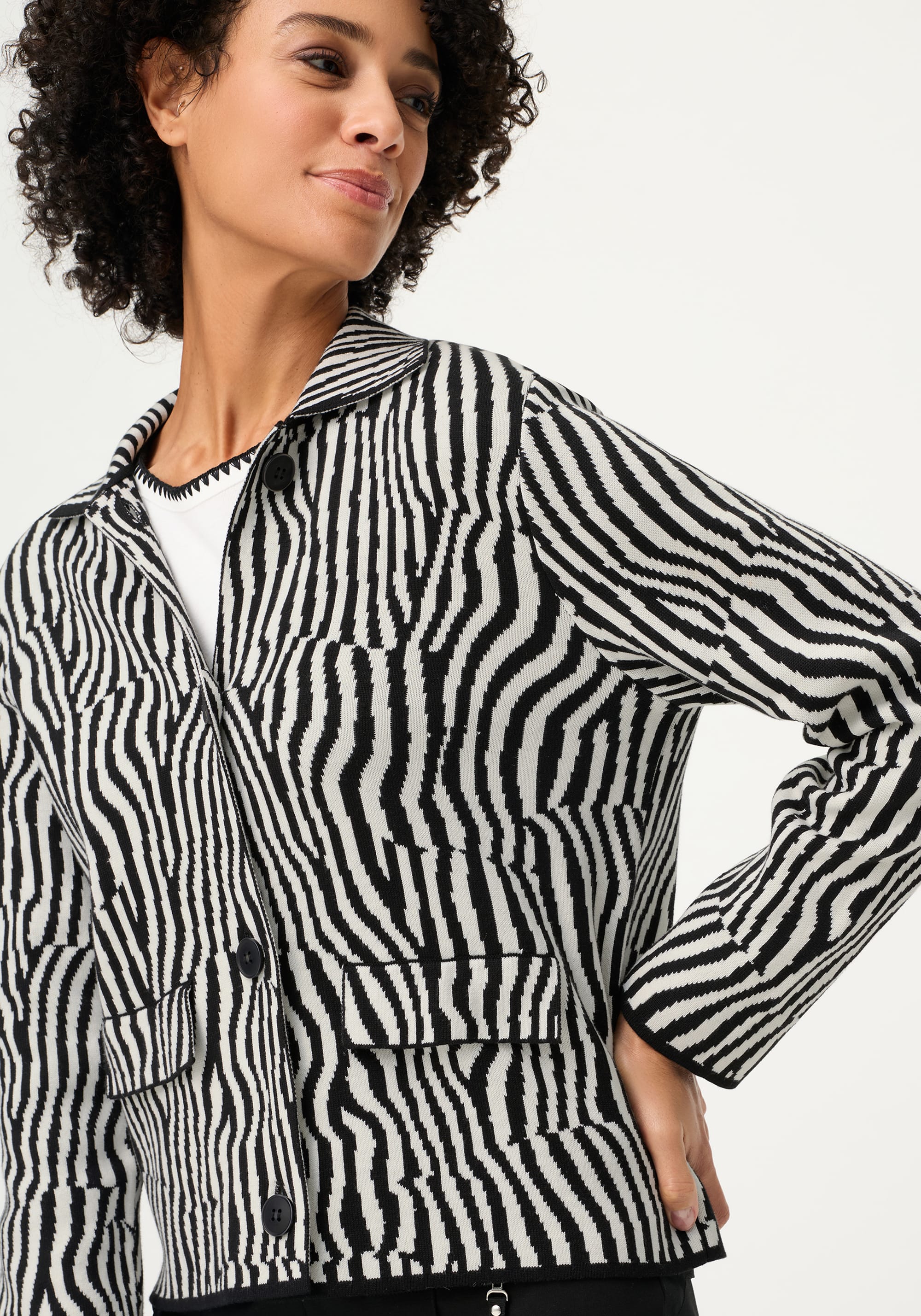 A refined cardigan that blends timeless tailoring with modern appeal, featuring a striking black-and-white palette and a fine all-over knit design for effortless polish.
