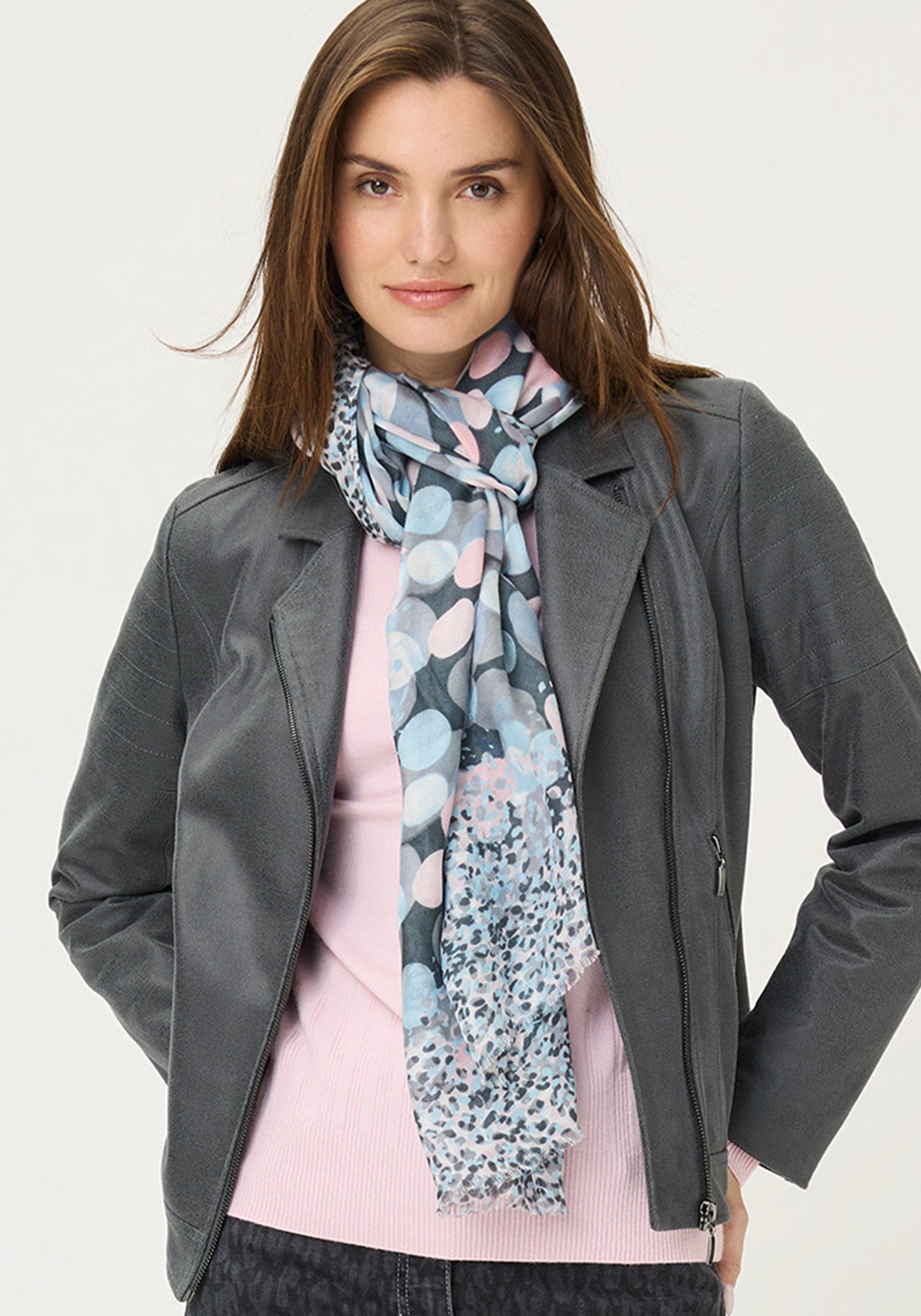 Digital dots meet a frayed edge in this digital print scarf—an easy and fun way to add a soft touch of colour to your look.