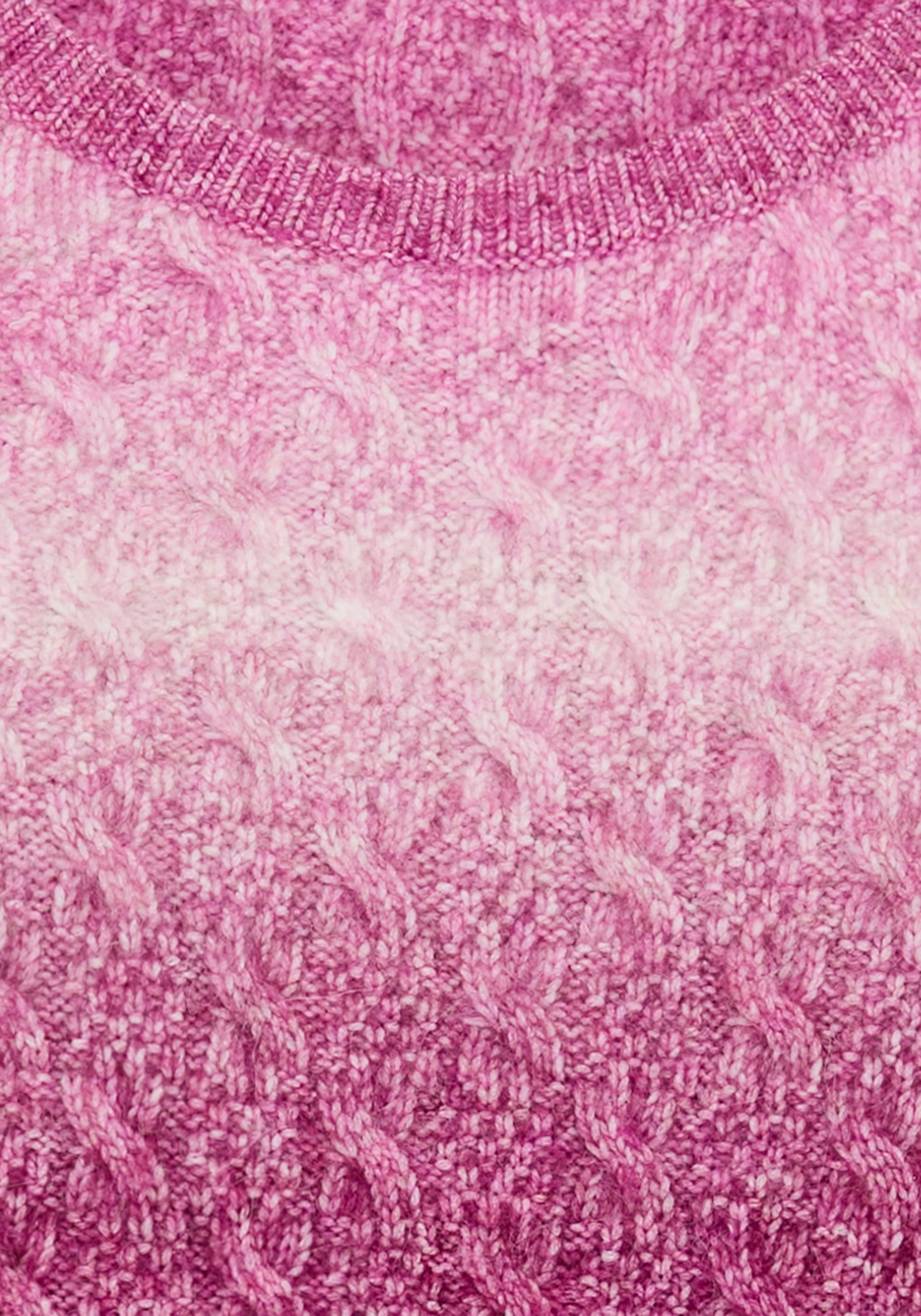 This sweater offers a charming twist on classic cable knit, beautifully showcased in soft, berry shades.