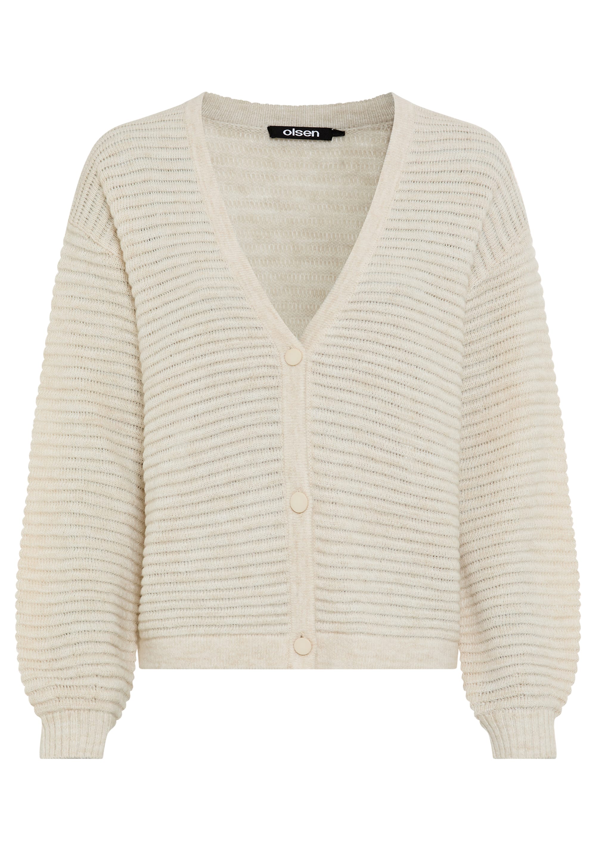 A modern cardigan with timeless appeal, defined by broad horizontal rib knitwork and a relaxed V-neck silhouette.