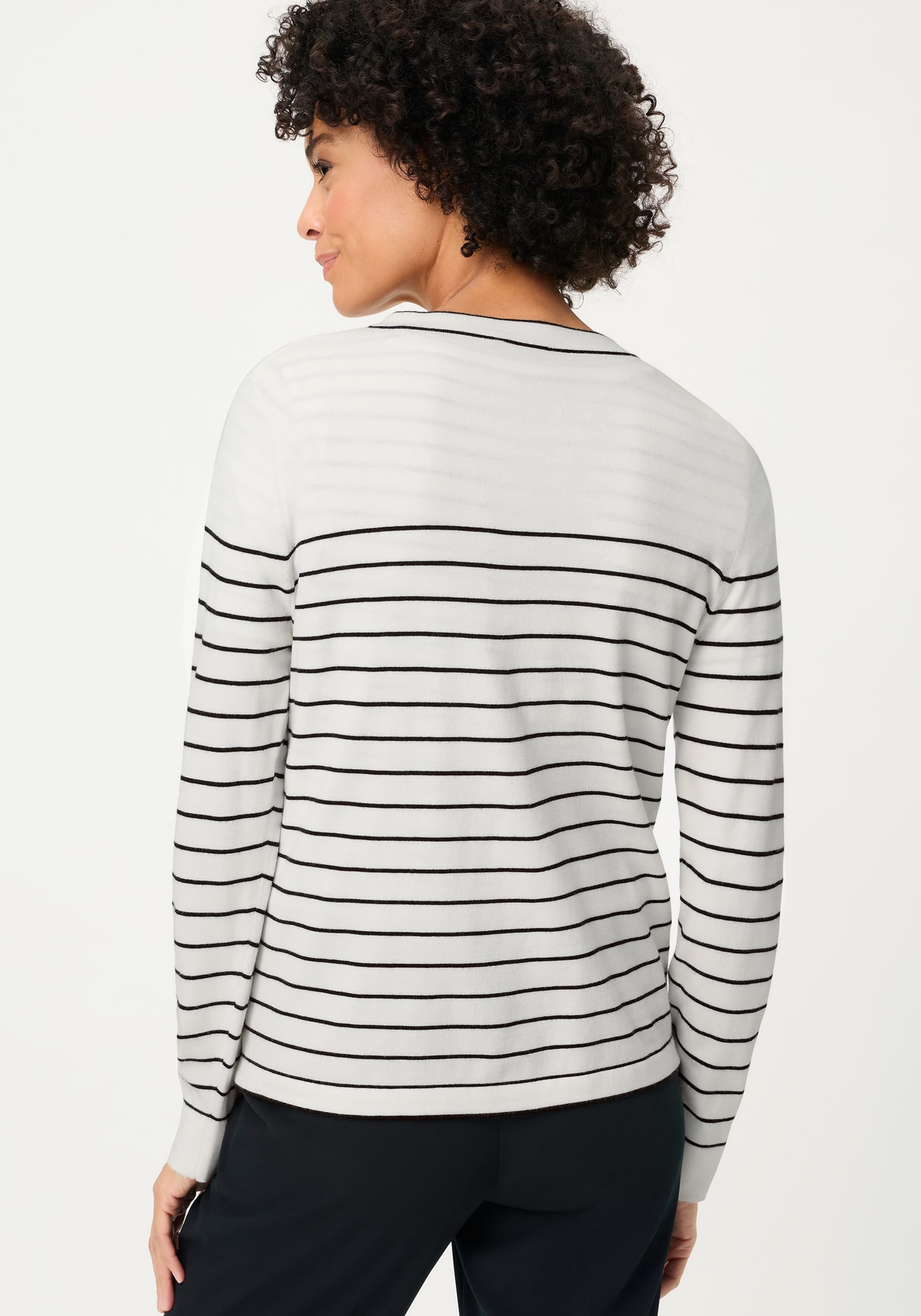 A timeless everyday cardigan with a refined, fashion-forward feel, defined by fine black stripes on an off-white ground for a look that never dates.