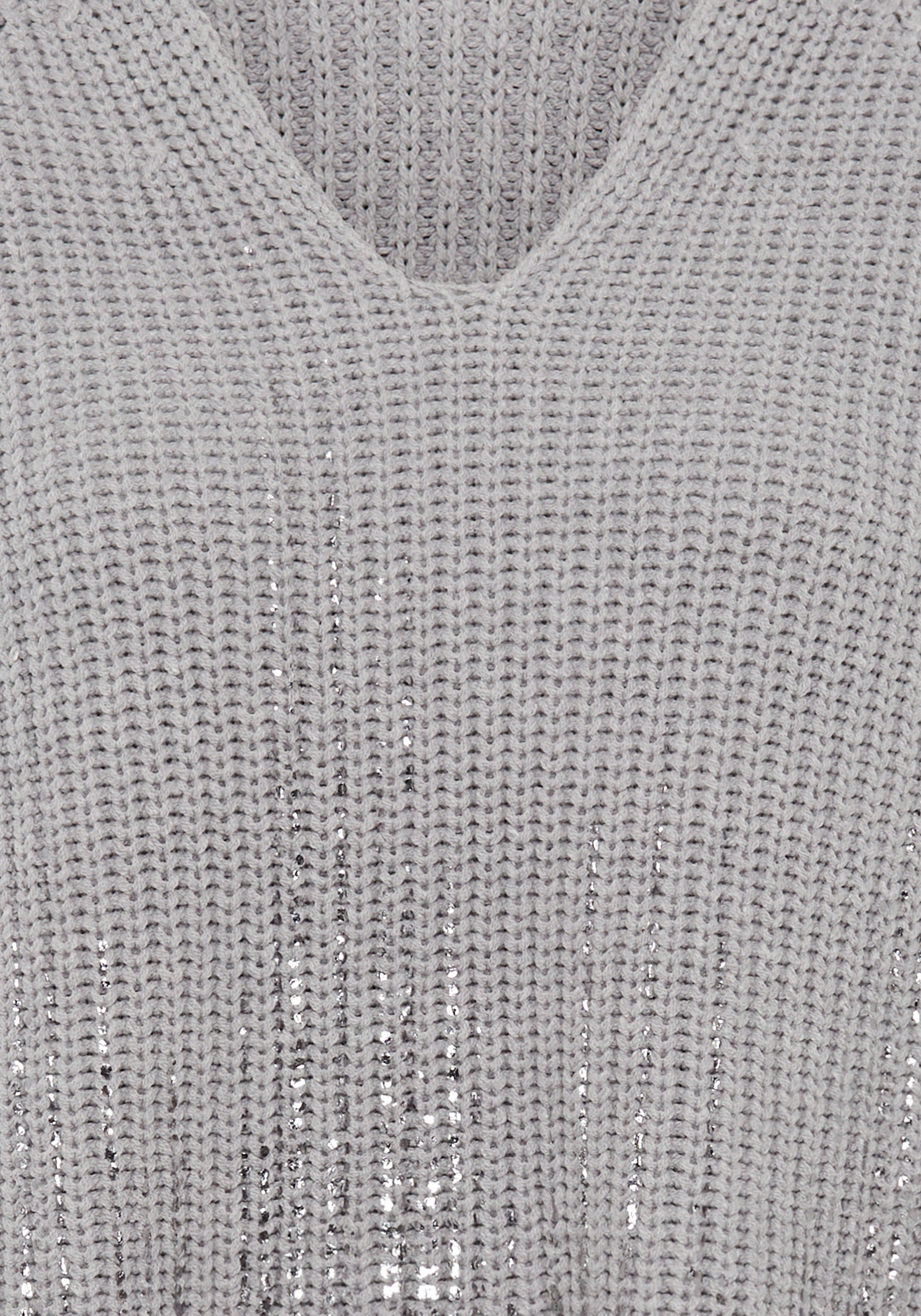 A classic shaker knit V-neck sweater is elevated with an abstract silver foil print at the front hem, adding a subtle touch of sparkle to this timeless style.