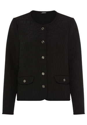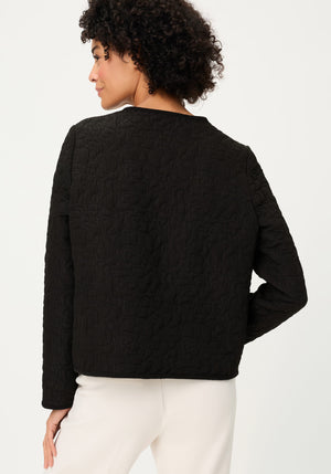 A modern jacquard jacket with a refined, collarless silhouette, designed to elevate everyday and business looks with subtle texture and shine.