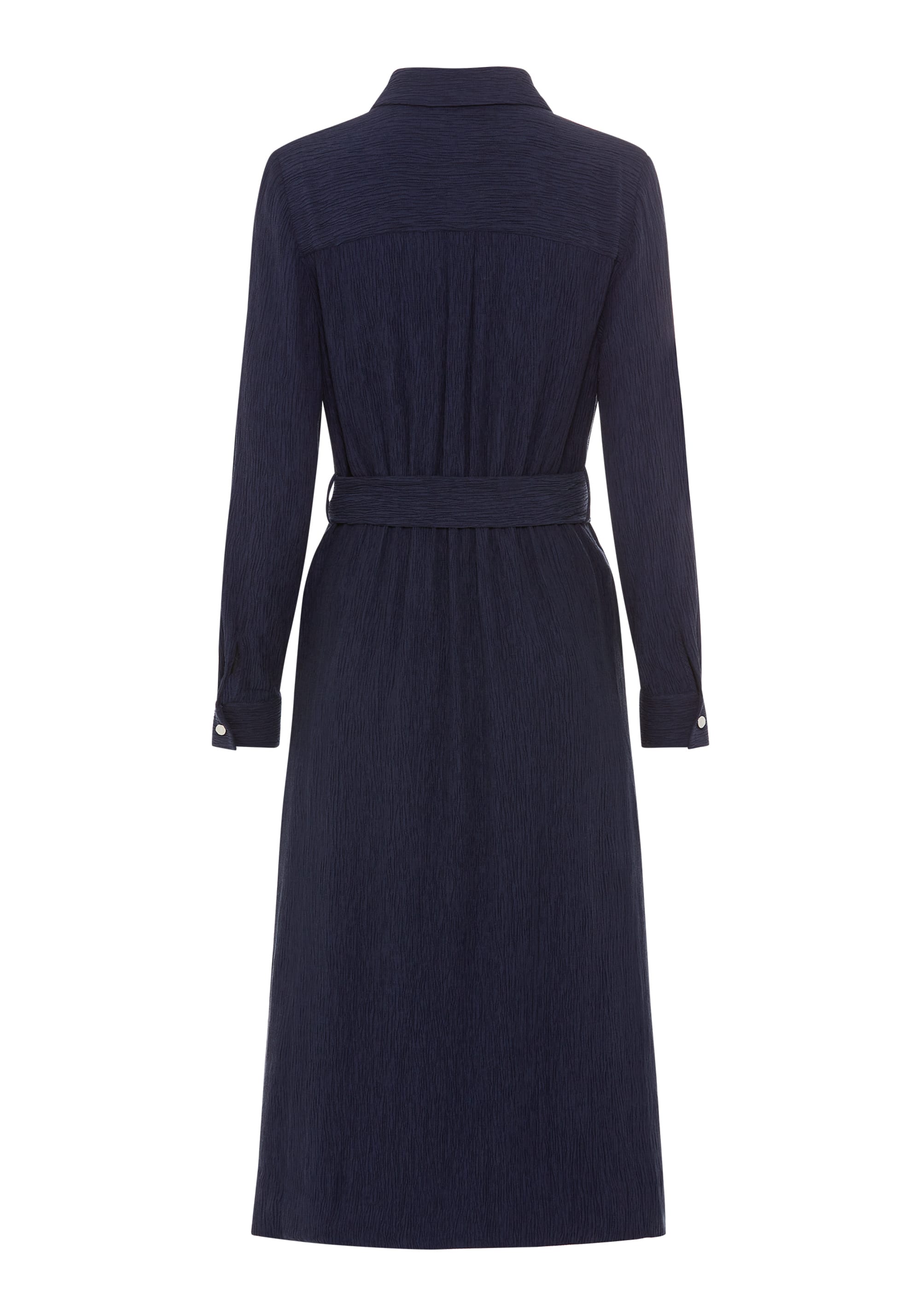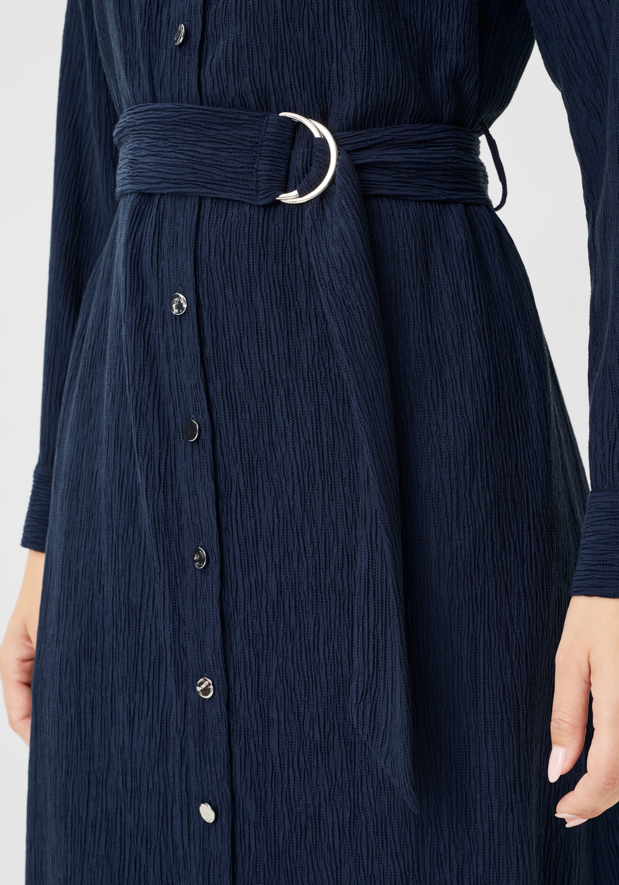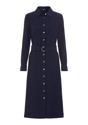 This modern take on a classic shirt dress effortlessly combines sophistication with stylish details, including buttons, a self-fabric waist tie belt, and rolled button sleeves.