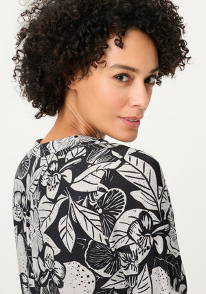 Une robe légère qui se démarque par son imprimé floral audacieux noir et écru, pour une allure moderne et féminine tout en légèreté.