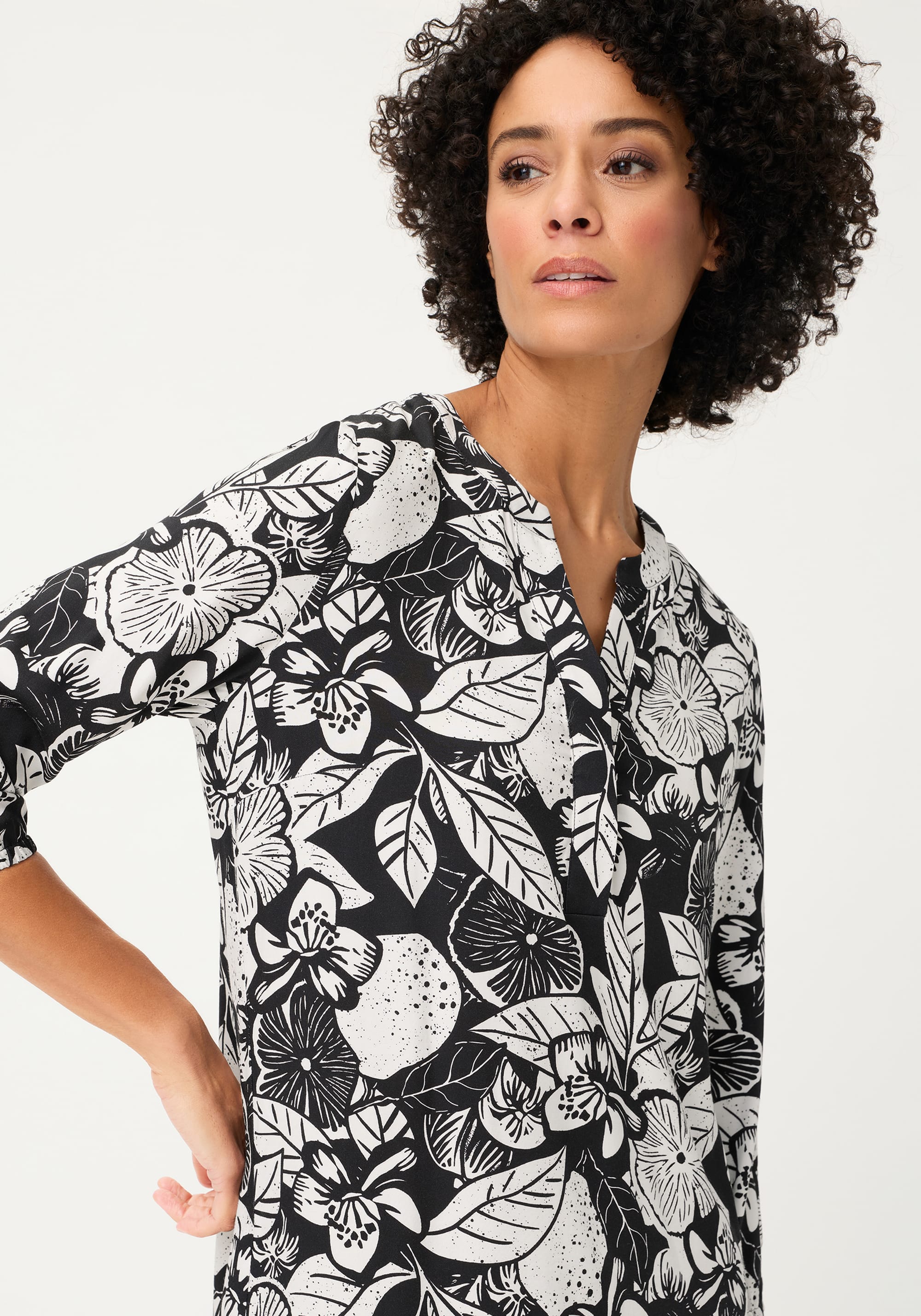 • Finished with 3/4-length sleeves featuring elasticated cuffs, this style balances comfort and polish for everyday versatility.