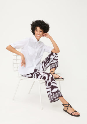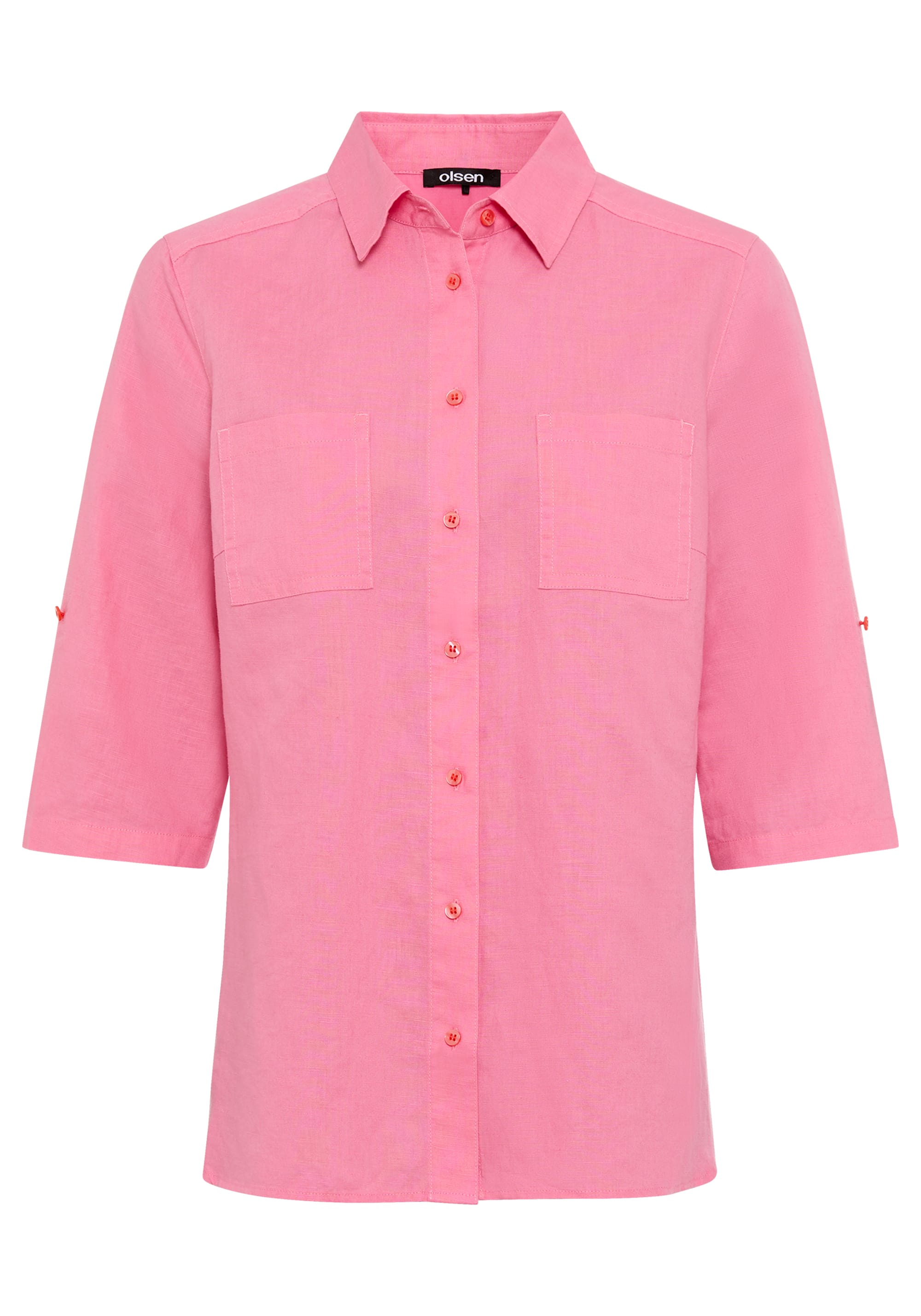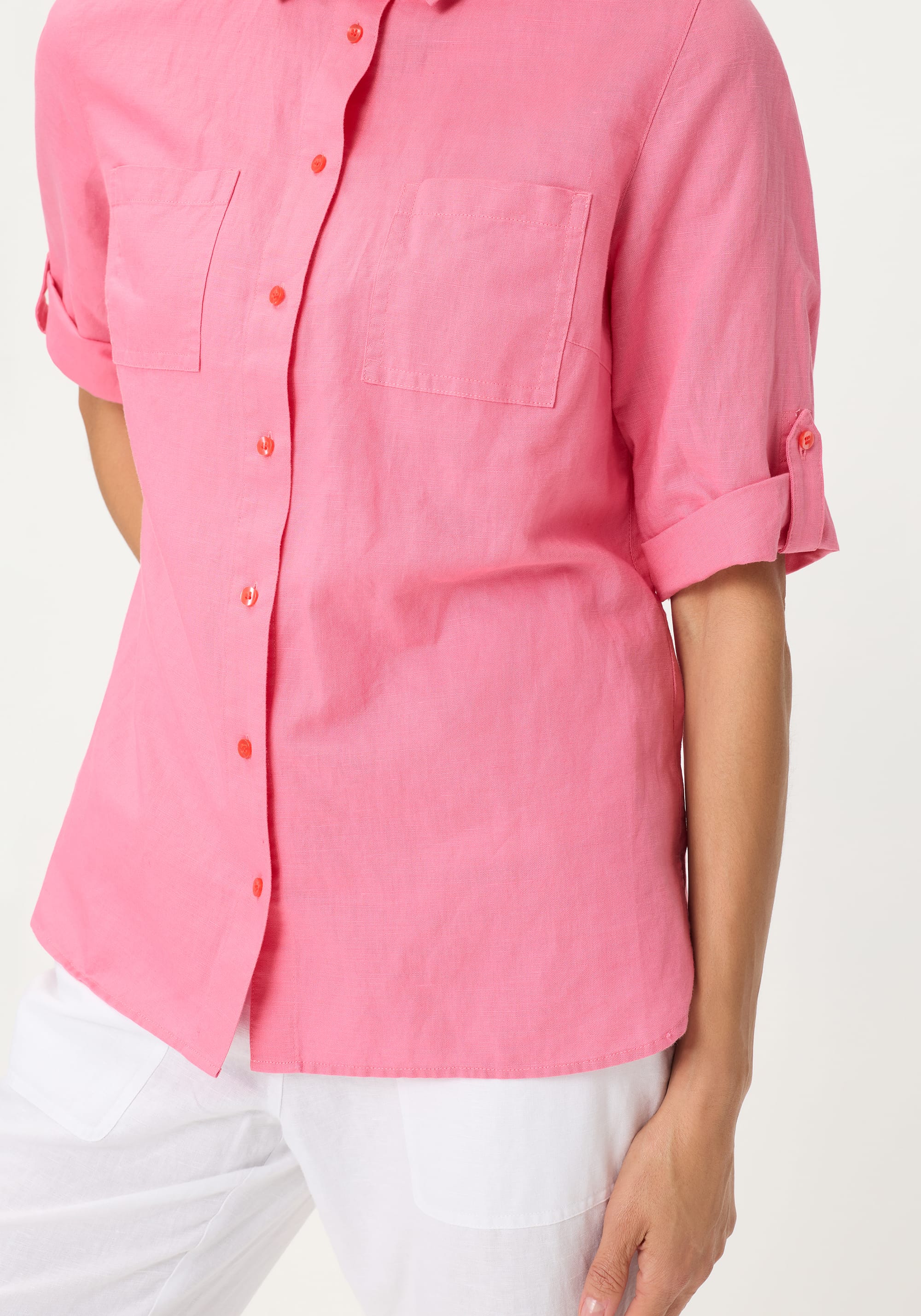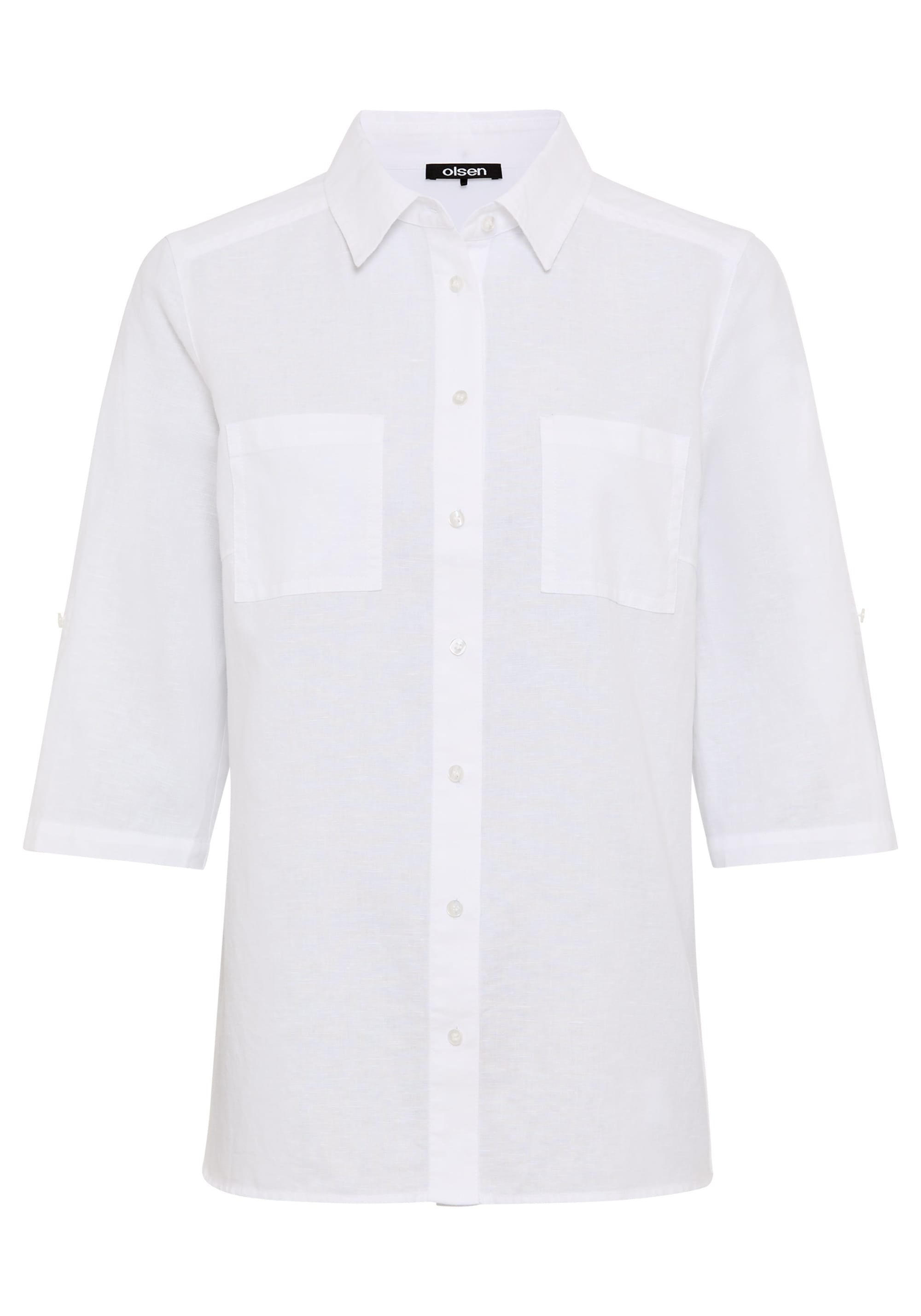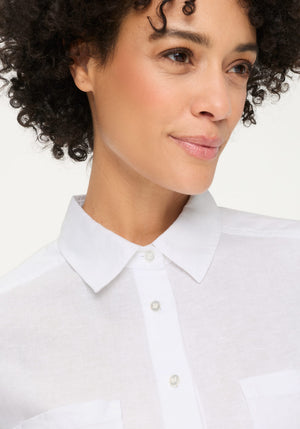 A timeless linen-blend blouse defined by clean lines and understated elegance, perfect for warm-weather dressing.