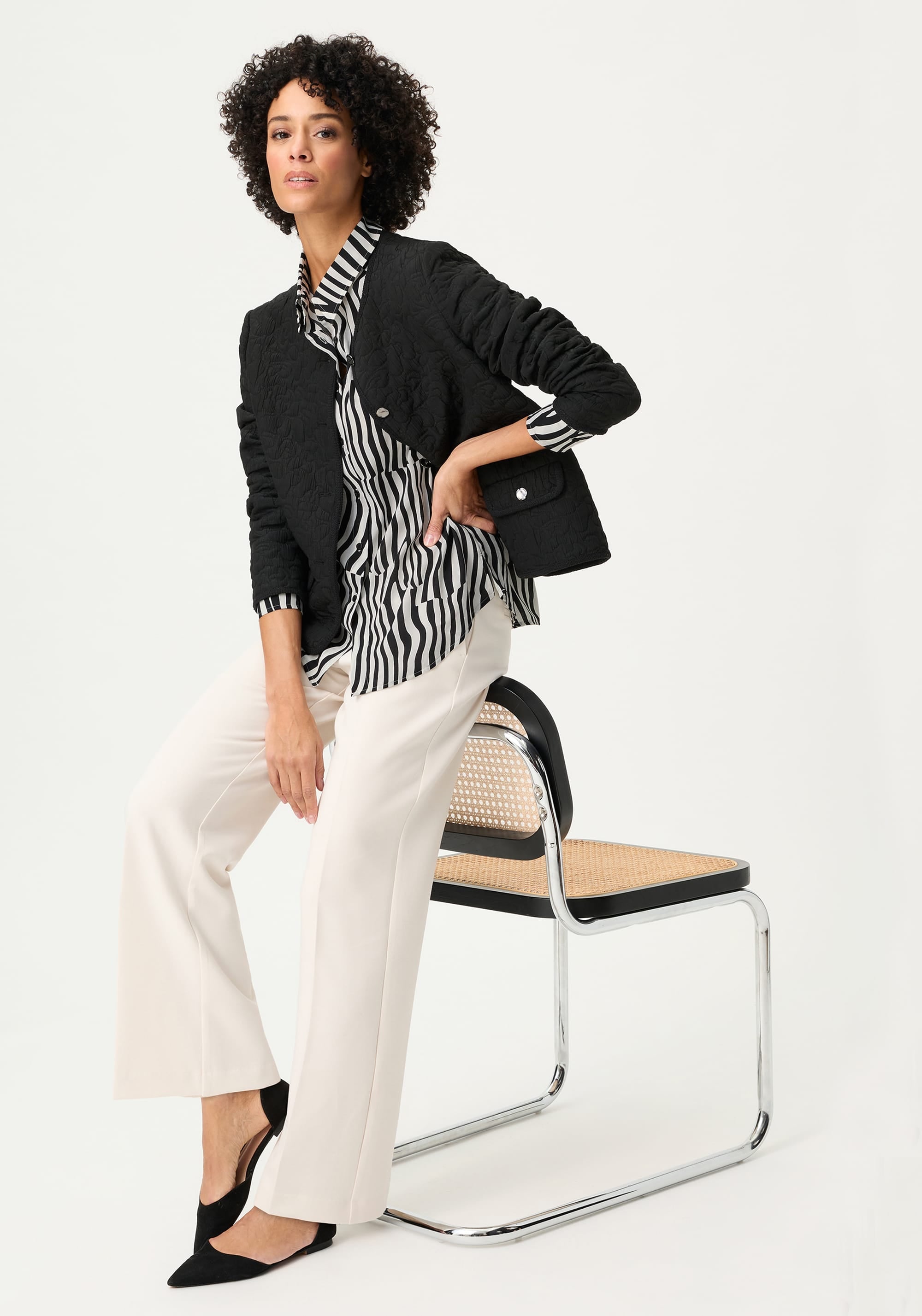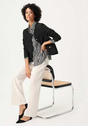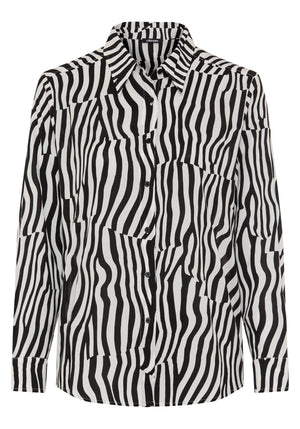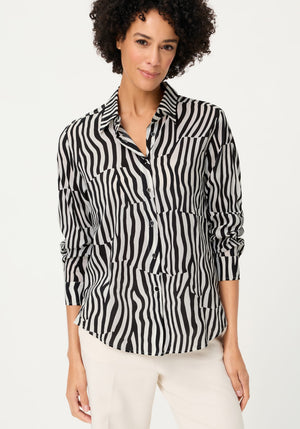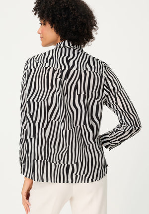 A fluid, feminine blouse that stands out with a striking modern zebra print, subtly energizing the look while remaining effortlessly wearable.