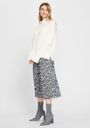 This stylish skirt features an elasticized pull-on waistband and an allover tonal leopard pattern, making it a standout piece.