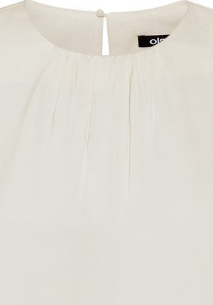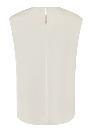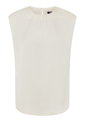 A sleeveless blouse with subtle shimmer and delicate pintuck detail at the neckline for a feminine touch.