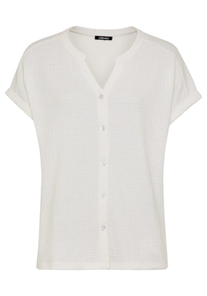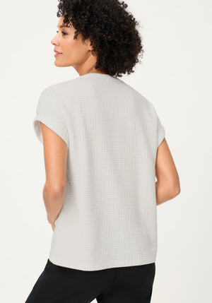 A timeless everyday T-shirt with a stylish twist, featuring a feminine V-neck, durable waffle-knit texture, and a versatile button-front design.