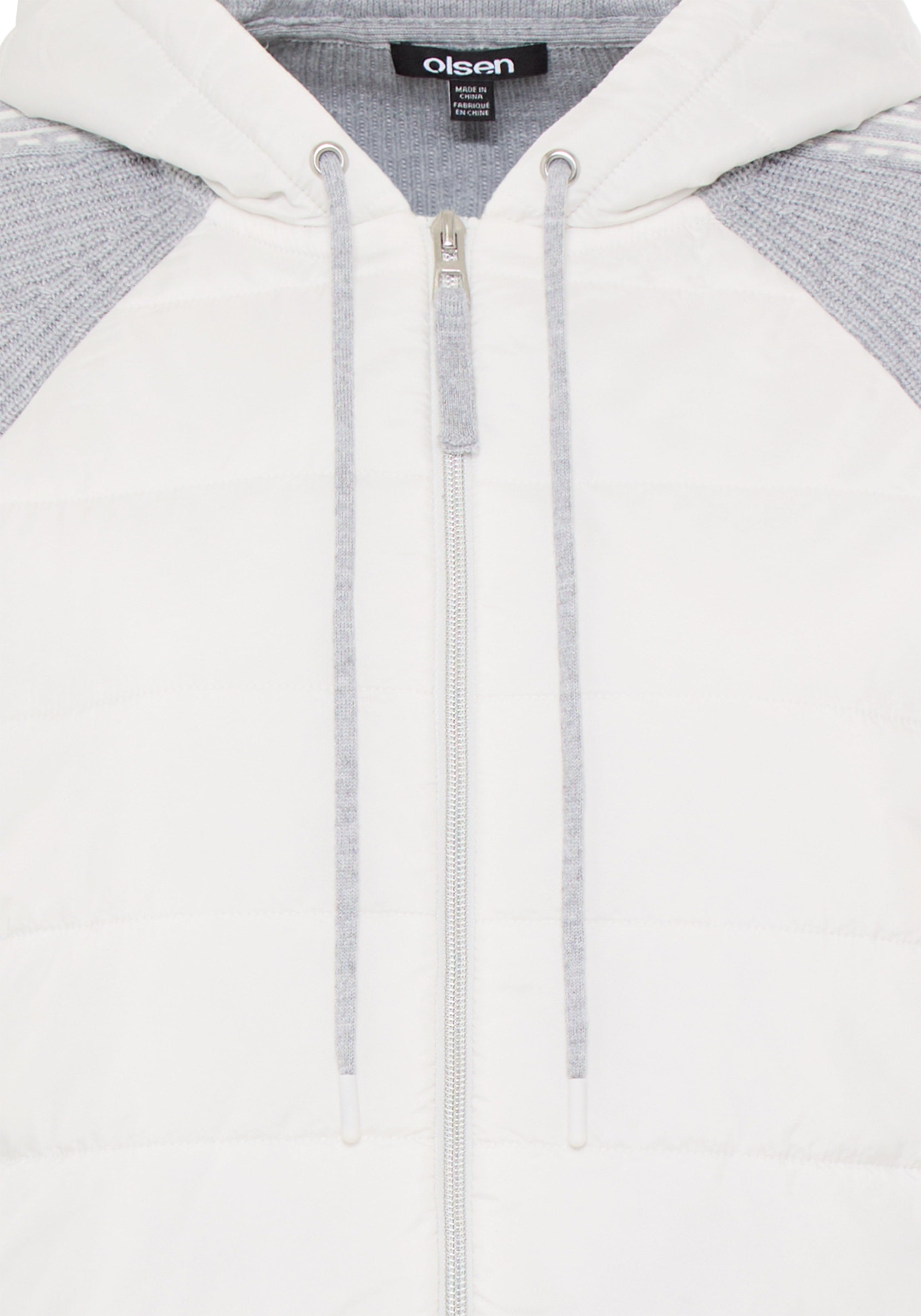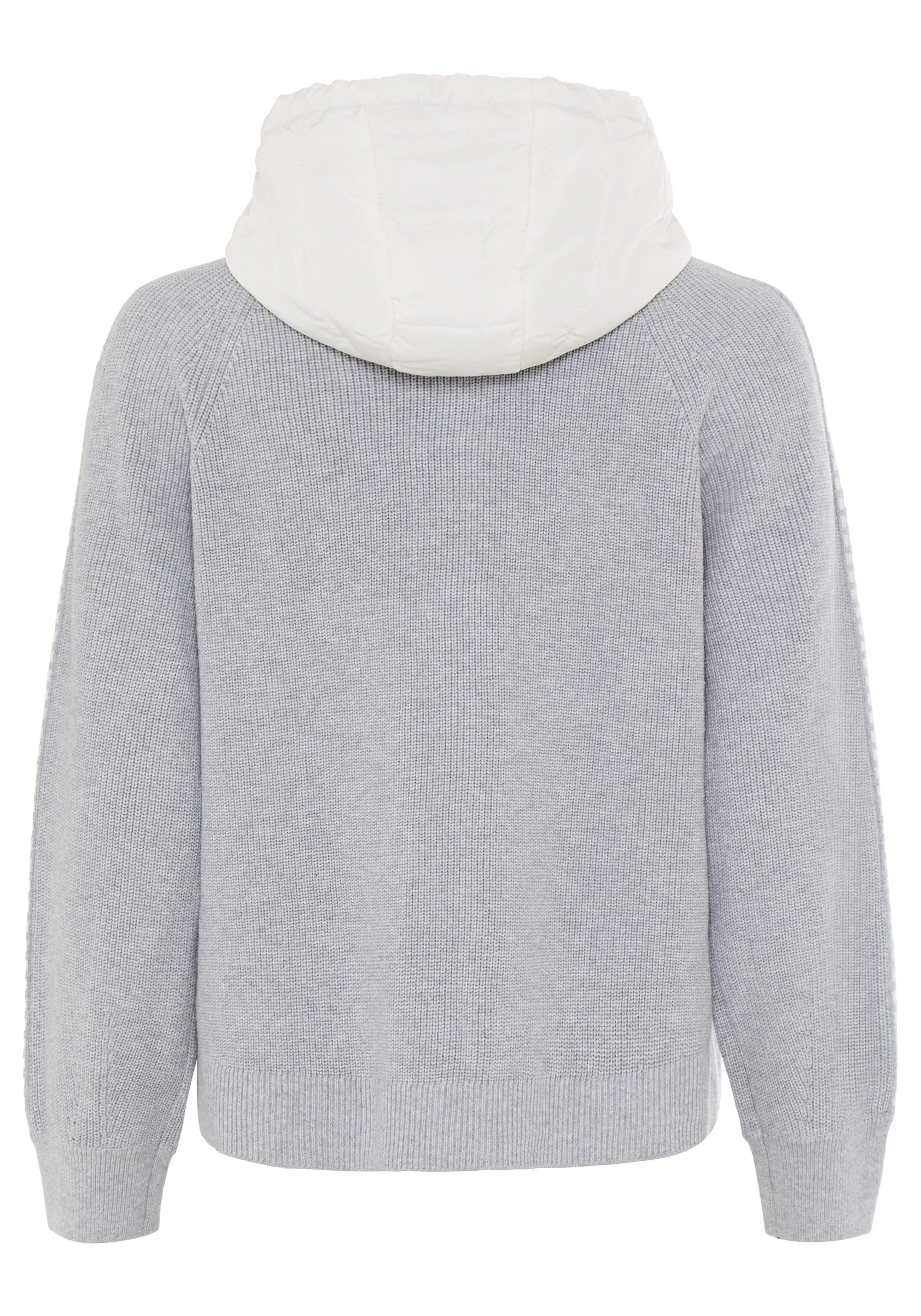 This zip-front knit jacket combines quilted nylon on the front and hood with robust knit sleeves and back for a modern mixed-media look.